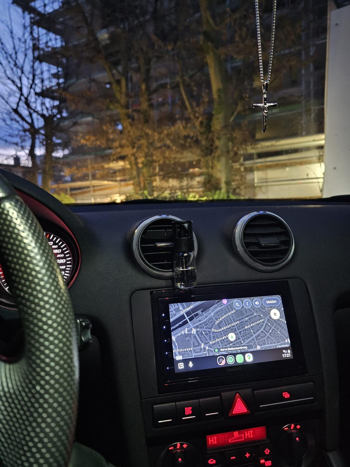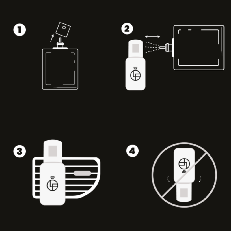 Am besten die Flasche am unteren Ende der Lüftung platzieren, da sich bei sehr kalter Luft Kondenswasser bilden kann. Dies kann den Duft leicht trüben, was aber unbedenklich ist.